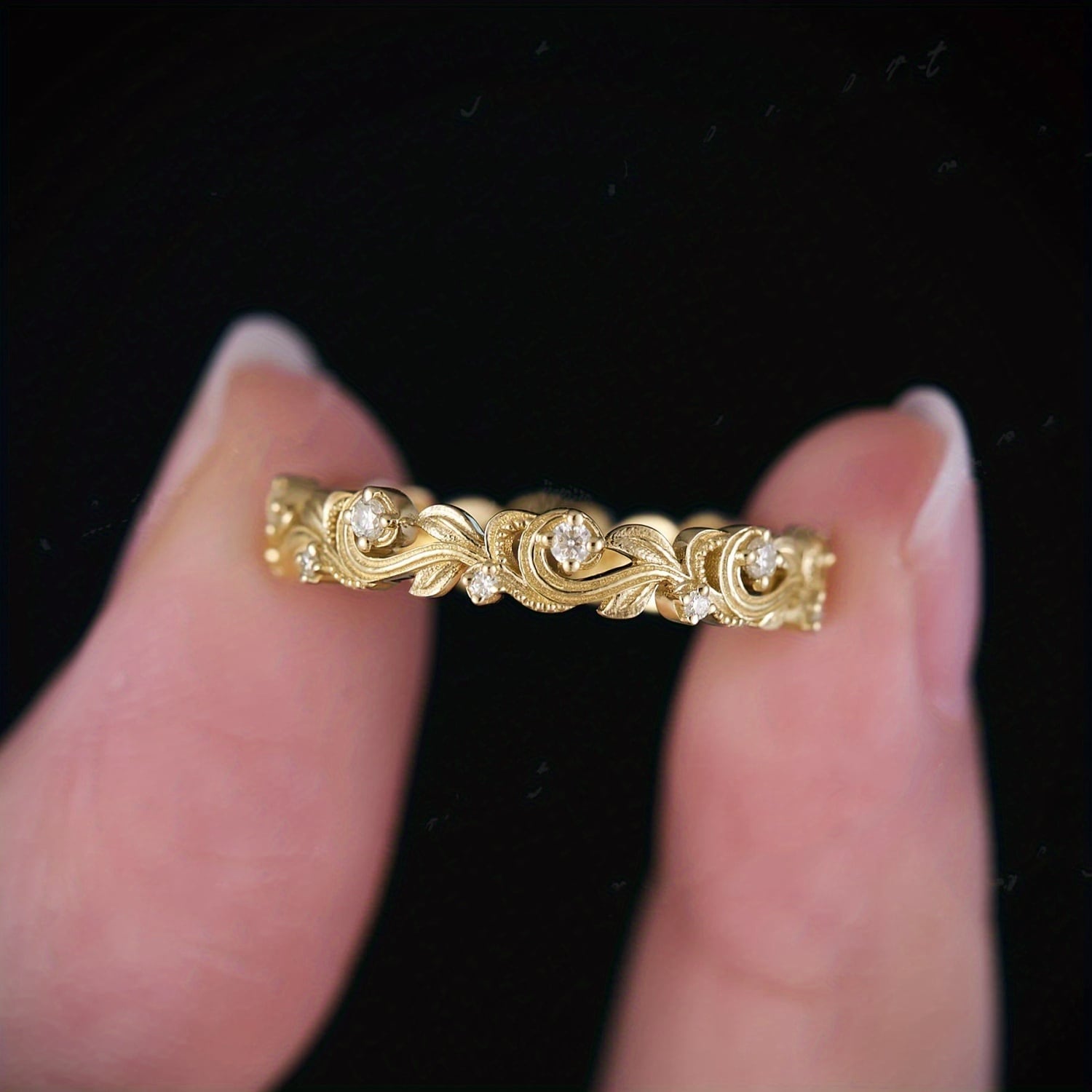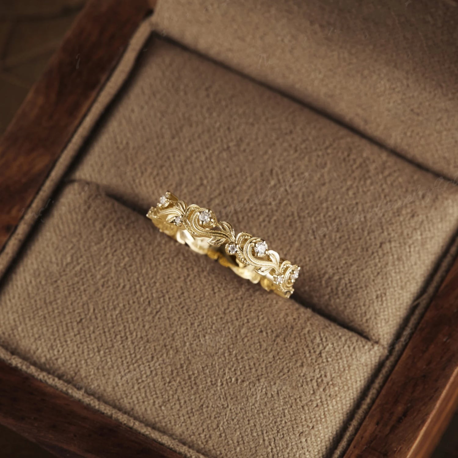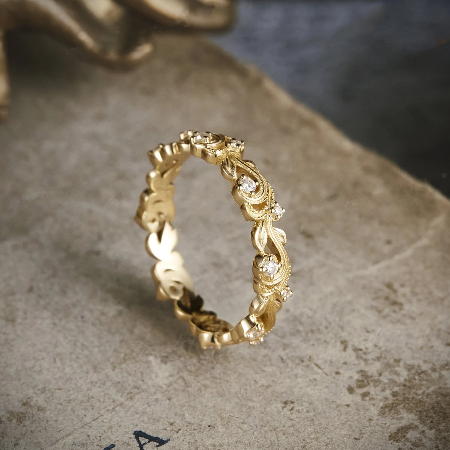 繊細なリーフモチーフが連なる、クラシカルなアンティークリング。